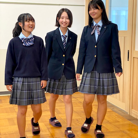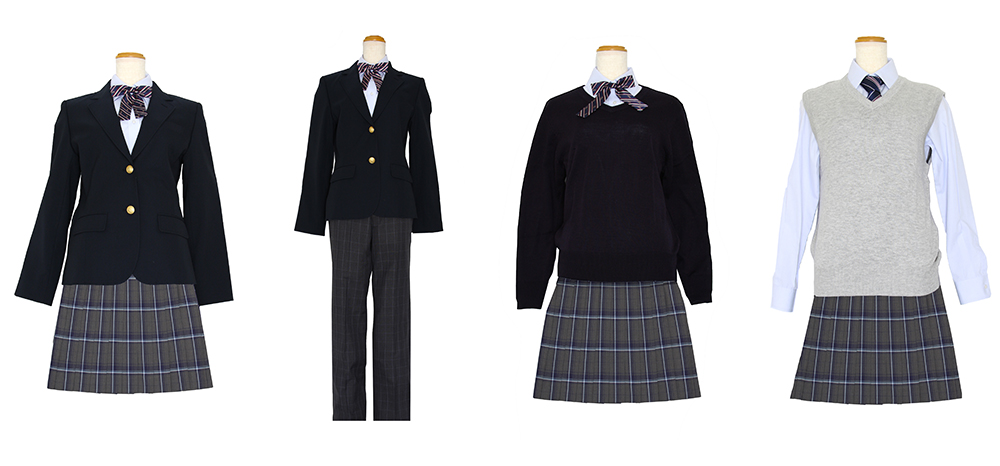 学校の校旗カラーである紫を配色したスカートを採用した。多様性の時代に、リボン・ネクタイは複数から選べるようにすることで、生徒自身が自ら考えてコーディネートできるようにした。スラックスは学校のイメージ青カッターシャツと合わせやすい水色のウィンドペン柄に。肌寒い季節でも体温調節しやすい中間服としてベスト・セーターを新たに採用。ニットの胸元には、学校のイニシャルロゴの刺繍を入れ、学校オリジナルニットにした。